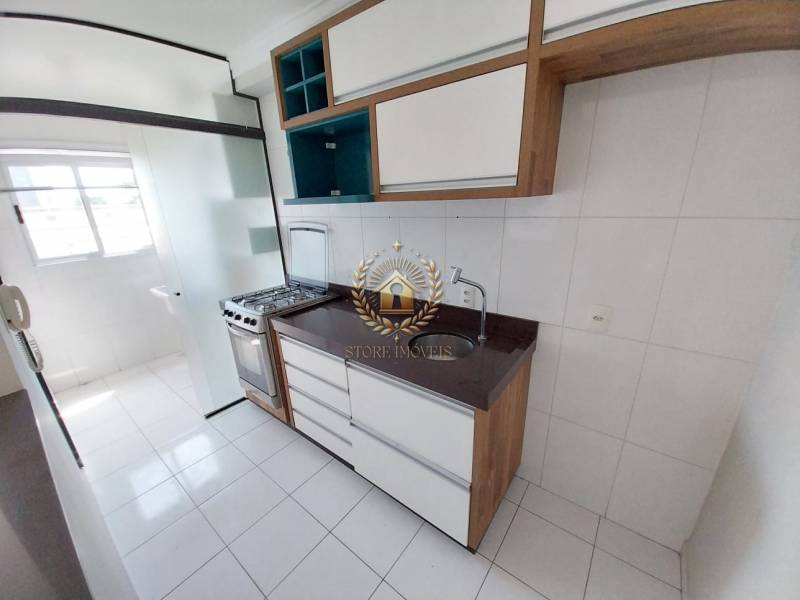 - Cozinha com armários planejados, fogão embutido e divisória em vidro para área de serviço;